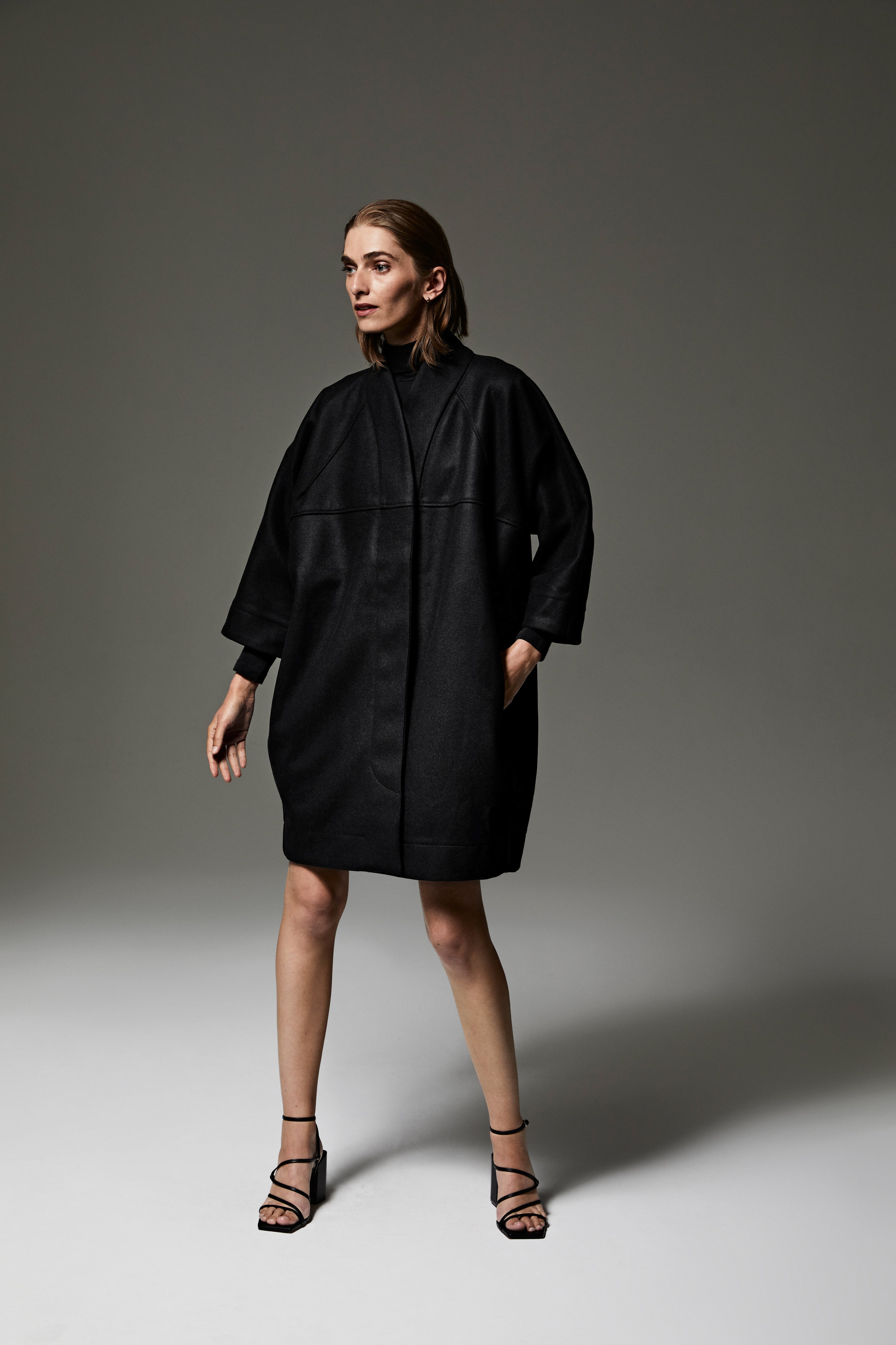 Reinterpretation of Balenciaga's One-Seam Coat, this cocoon coat features darts on sleeves and lower back that take away excess volume to follow the silhouette. Refined with a mid-high collar adding quintessential elegance and comfort. “Secret pockets” in the lateral side seams, and concealed front fastening.