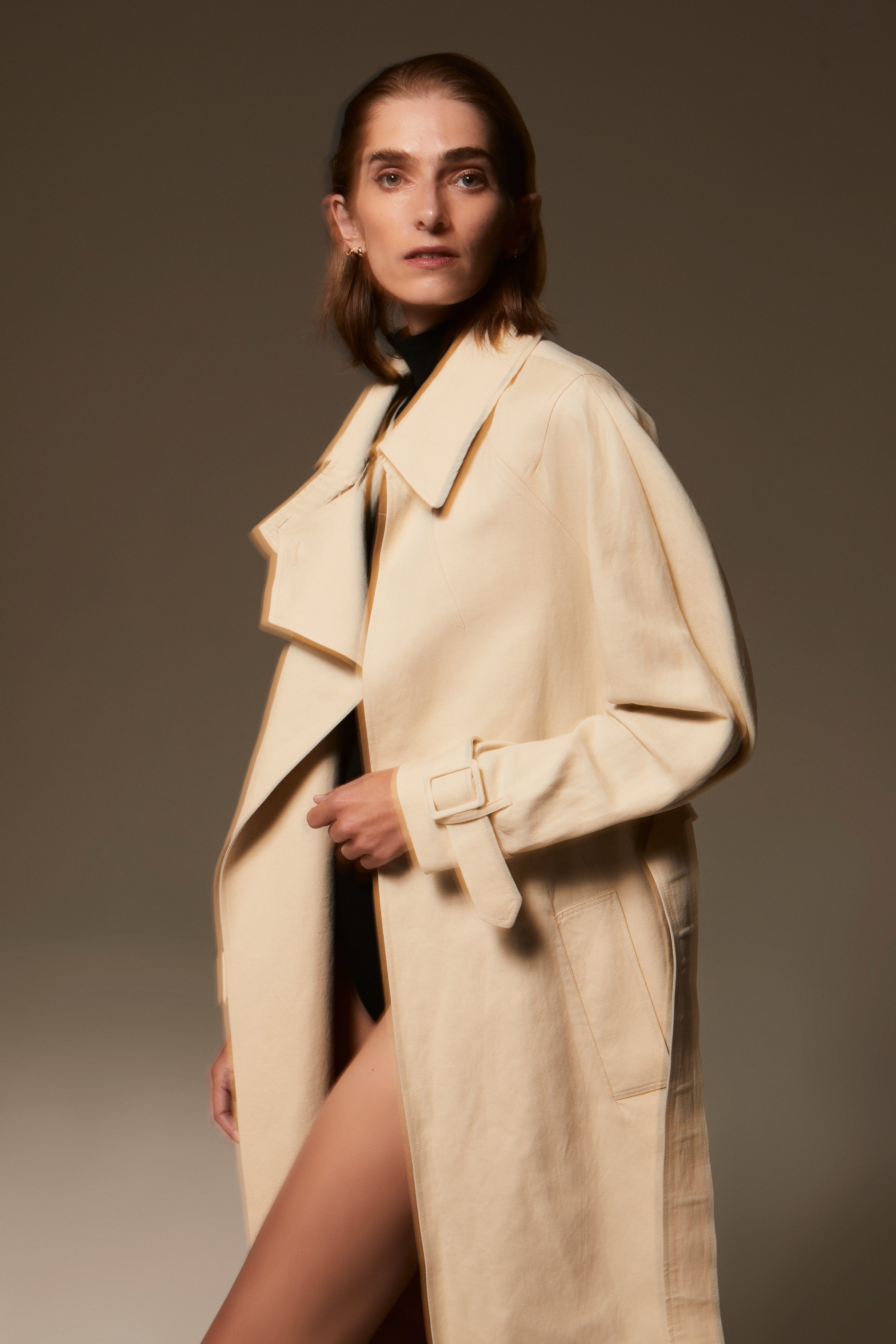 Introducing our modern interpretation of the timeless trench coat, blending 19th-century charm with minimalist sophistication. Retaining essential elements, such as Raglan sleeves, a double-breasted pattern, sleeve straps and a bucket belt, our Charlie trench coat exudes timeless elegance.