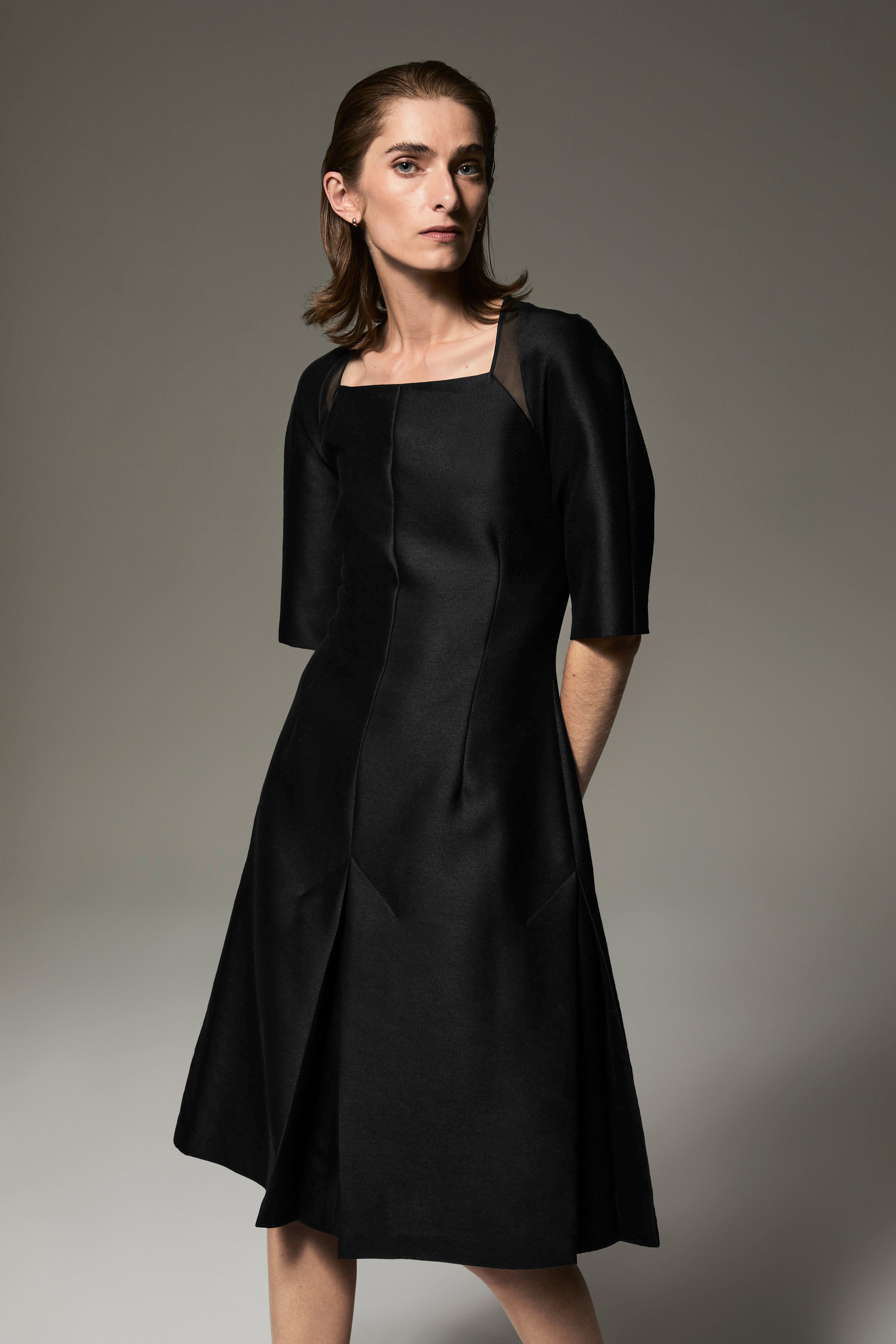 Little black dress with square neckline and silk chiffon between yoke and shoulder that creates an intriguing “bolero” effect. The lower part features 4 box pleats for extravagant mobility.