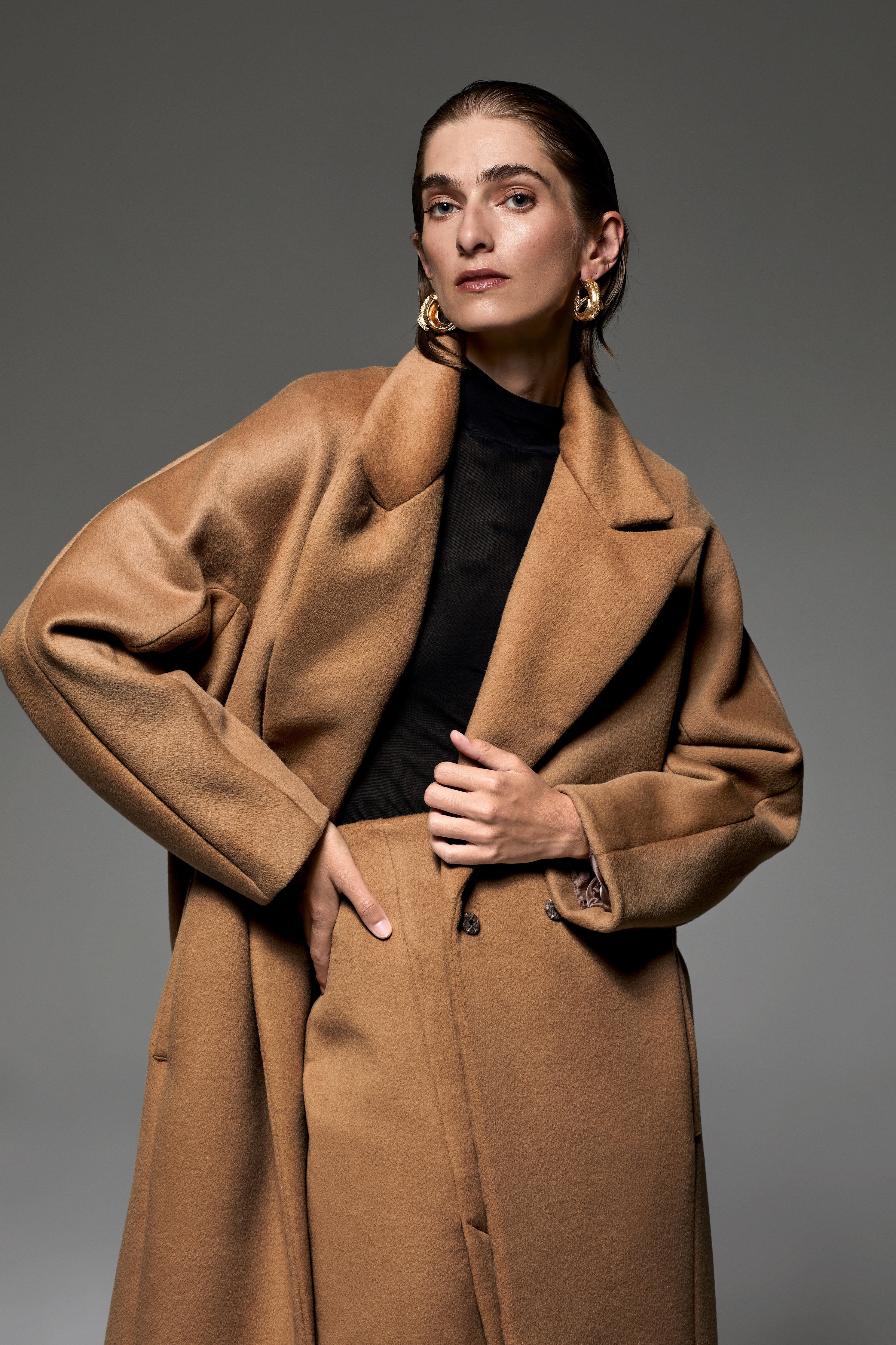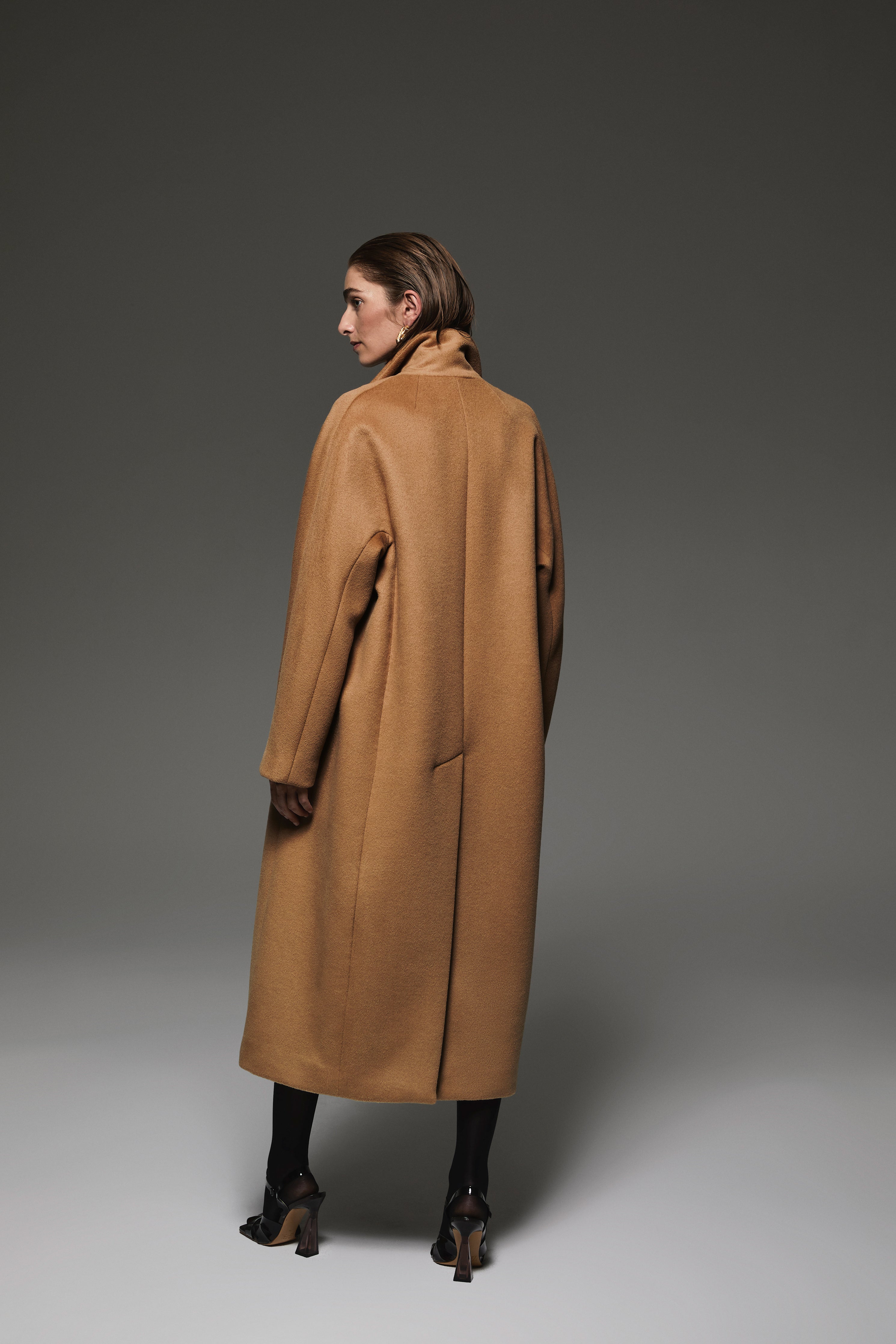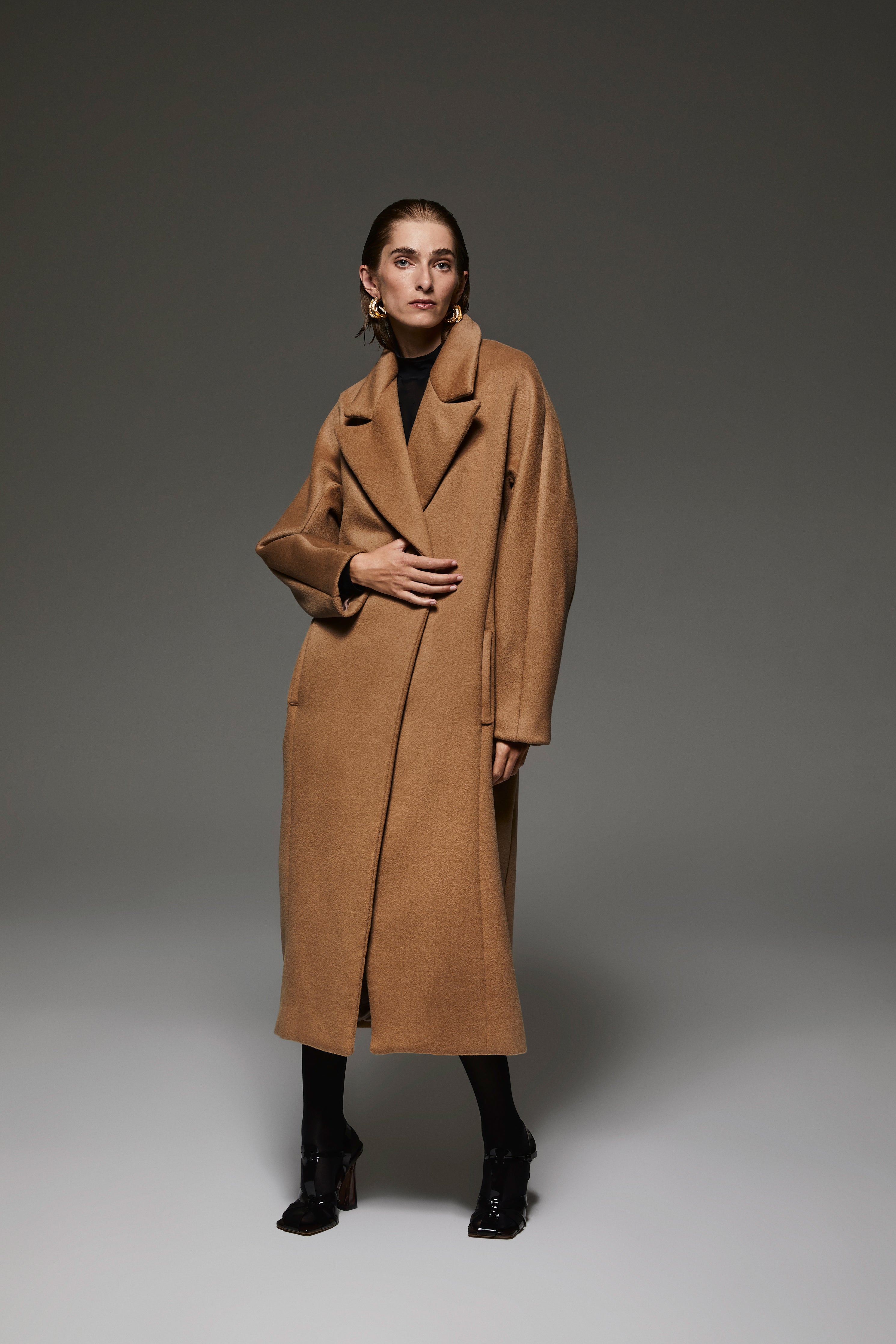 A long double-breasted statement coat to snuggle in during colder days of the year. It has a wide-notch lapel collar. Concealed front fastening.